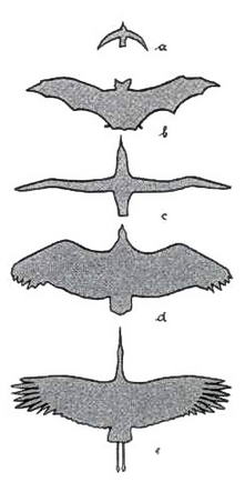 Контуры некоторых птиц и летучей мыши (а — ласточка, b — летучая мышь, с — альбатрос, d — коршун, е — аист).
