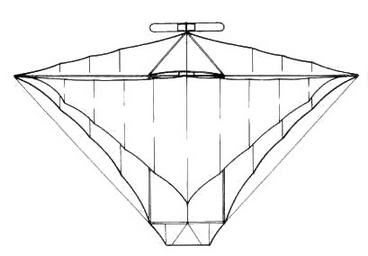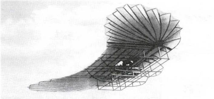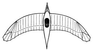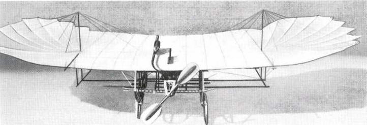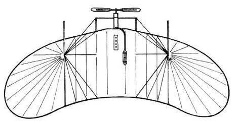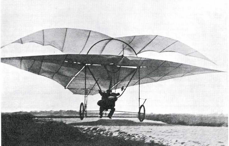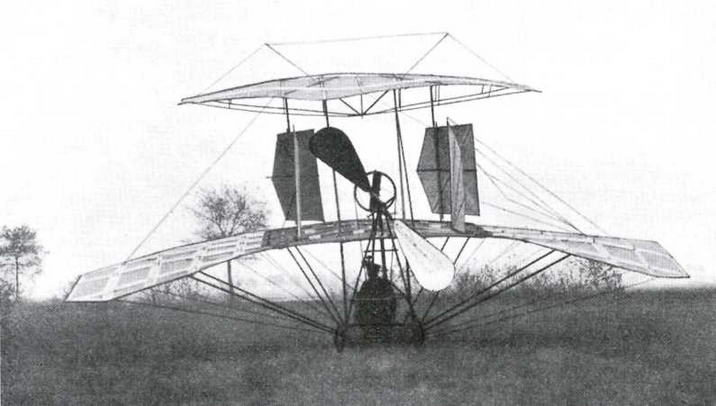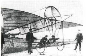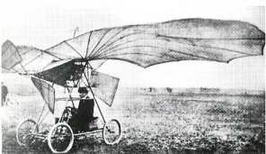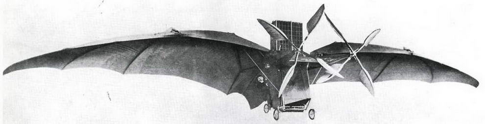 В 1906 г. в пригороде Парижа начались испытания еще одного самолета- "бесхвостки" с крылом, напоминающим по форме то ли крыло летучей мыши, то ли какого-то доисторического летающего ящера. Расходящиеся веером планки-нервюры были обтянуты полотном. Сверху крыло поддерживалось проволоками, соединенными с двумя мачтами. Снизу была прикреплена четырехколесная тележка из стальных труб, на которой находились сидение пилота и небольшой углекислотный двигатель (поршневой мотор, работающий на сжатой углекислоте) с пропеллером.