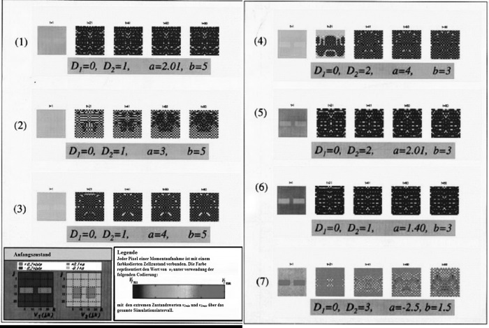 Возникновение структур математически соответствует неоднородным решениям рассматриваемых дифференциальных уравнений, которые зависят от различных контрольных параметров (например, концентраций химических веществ, АТП-энергии в клетках, нейрохимических рассылающих сигналы тканей нейронов). Для рассматриваемых примеров дифференциальных уравнений мы можем систематически определить пространство параметров, точки которого репрезентируют все возможные величины контрольных параметров соответствующей системы. В этом пространстве параметров можно точно определить с помощью упомянутых тестовых критериев области локальной активности и локальной пассивности, которые или дают возможность формирования структур или являются с математической точки зрения «смертельными». С помощью моделирования на компьютере в принципе можно для каждой точки в пространстве параметров вызвать формирование возможных структур и возможных паттернов (Рис. 2). В рамках такого математического моделирования можно полностью определить и предсказать формирование структур и их образцов (паттернов).