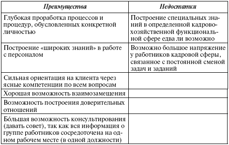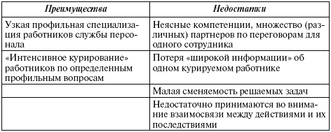 Функциональное разделение делает возможной сильную профильную специализацию службы персонала, однако оно имеет и недостатки: неясные компетенции, множество партнеров по переговорам для одного сотрудника, эффект потери «широкой информации» о курируемом работнике и др. (табл. 9.3).