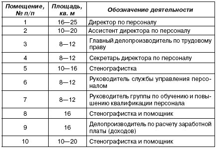 В зависимости от характера кадровой деятельности (работа с документацией, посетителями и т. д.) предлагались представленные в таблице нормы выделяемых служебных помещений. Показывая значения их усредненных площадей, авторы оговаривали, что организация «современных крупных отделов предприятий Германии подразумевает выделение 8—12 кв. м на рабочее место, в то время как на американских – 4,5–6,5».
