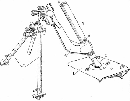 Легкий бомбомет (leichter Ladungswеrfer) состоит из трех основных частей (фиг. 61): опорной плиты 1, двуноги-лафета 2 и штока (стержня) 3 с поддерживающим кронштейном 4.