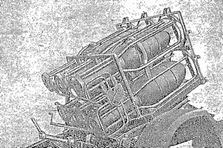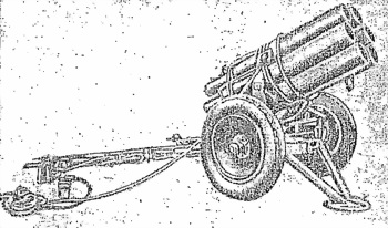 15-см химический миномет обр. 41[16] (фиг. 64) представляет собою шестиствольное орудие, стреляющее реактивными минами и предназначенное для стрельбы по площадям. Стрельба из 15-см минометов обр. 41 как правило, проводится в виде огневых налетов при максимальном темпе огня. Наивыгоднейшая дальность стрельбы — не меньше 4000 м.