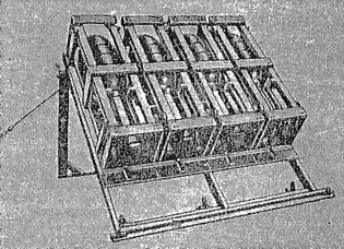 Тяжелая метательная установка обр. 40 (фиг. 65) предназначается для обстрела площадей реактивными минами: 280-мм фугасными и 320-мм зажигательными. Установка представляет собою деревянную раму (станок), на которую накладываются мины в деревянных укупорочных ящиках; последние служат как для перевозки мин, так и для их выстреливания.