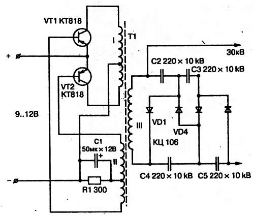Схема электрошокера представляет собой преобразователь постоянного напряжения, который состоит из генератора переменного напряжения и последующего выпрямителя этого напряжения. Генератор собран на транзисторах VT1, VT2 и трансформаторе Т1. Обмотка I трансформатора является коллекторной, обмотка II — базовой. Подключение концов базовой обмотки к базам транзисторов осуществляется таким образом, чтобы соблюдались условия генерации: при отсутствии генерации нужно поменять местами концы этой обмотки. Резистор R1 и конденсатор С1 предназначены для задания рабочего режима транзисторов. Обмотка III — выходная, к ней подключен умножитель напряжения, выполненный на выпрямительных столбах VD1-VD4 и конденсаторах С2-С5.