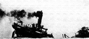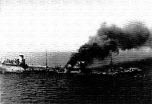 Гибель английского танкера, торпедированного немецкой подводной лодкой.
