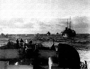 Шлюпка с борта «Спенсера» спешит выловить из воды членов команды немецкой лодки U175.