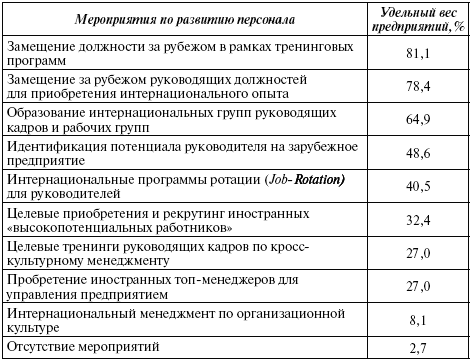 В зависимости от целей на интернациональных предприятиях используются различные формы развития работников. Определяя их, менеджер по персоналу, исходя из опыта международной деятельности, должен принимать во внимание, что работа за рубежом уже является одним из наиболее эффективных способов совершенствования специалистом или руководителем своих знаний и навыков. Результаты обследования, проведенного на интернациональных предприятиях Германии, позволили выявить основные мероприятия, реализуемые персонал-менеджментом для развития занятых за рубежом сотрудников (табл. 8.11).