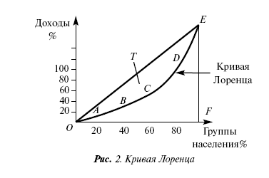 Если наблюдается равенство доходов, то оно отражается прямой линией ОЕ. Если происходит неравенство в доходах, то линия ABCDE показывает фактическое распределение доходов и называется кривой Лоренца.
