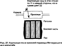 К этому внутреннему склепу ведет нисходящий коридор, открывающийся в две прихожие. В стенах первой вырублены 22 прямоугольные ниши — по 11 с каждой стороны (рис. 27). Это число отражает другую пропорцию пирамиды.