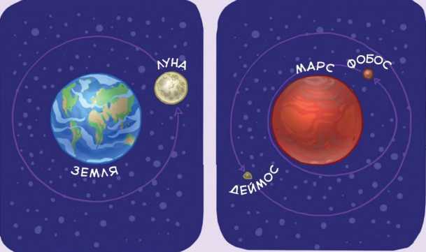 У Земли есть спутник — Луна. А у Марса их целых два: Фобос и Деймос.