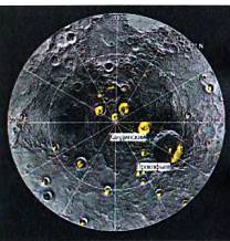 На компьютерном изображении северного полярного региона Меркурия желтым цветом показаны кратеры, где обнаружен лед.