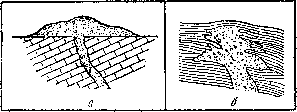 Рис. 5. Разрезы горных пород: а — разрез вулканической горной породы, вылившейся на поверхность Земли из трещины в расплавленном виде; б — разрез массивной горной породы, прорвавшей слои осадочных пород.