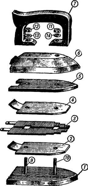 Все части утюга скрепляются двумя болтами 9 и 10 с гайками 11 и 12 и шайбами 13 и 14.