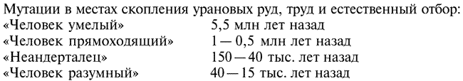Что было причиной появления человека именно в Восточной Африке? Дело в том, что на этой территории отмечены выходы урановых пород и зафиксирована повышенная радиация, что, как доказано генетикой, вызывает мутации. Таким образом, эволюционные изменения здесь могли протекать более быстрыми темпами. Возникший вид, физически более слабый, чем окружение, чтобы выжить, должен был начать изготавливать орудия, вести общественный образ жизни. Все это способствовало развитию разума как мощного инструмента слабого от природы существа, не обладающего достаточными естественными органами защиты.
