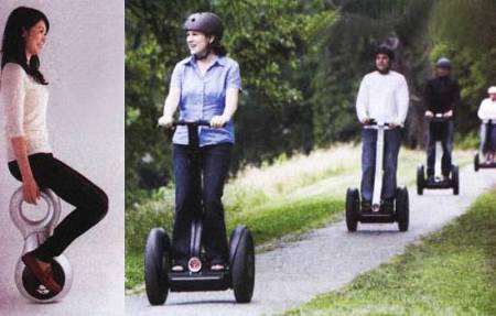 Многие уже наслышаны об оригинальной двухколесной тележке американского конструктора Дина Кеймана, который в 2000 году поспешил назвать свое изобретение «колесницей XXI века». Ходили самые невероятные слухи о том, что же представляет собой «революционное изобретение». Однако оказалось, что на самом деле транспортное средство под названием Segway напоминает обыкновенный самокат с длинным рулем под рост взрослого человека и колесами, поставленными не одно за другим, как обычно, а параллельно друг другу. Самокат рассчитан на передвижение одного человека. Но в отличие от обычного детского, он оснащен электродвигателем, питаемым от аккумуляторов, и способен развивать скорость до 20 км/ч. С одной зарядки можно проехать 38 км.