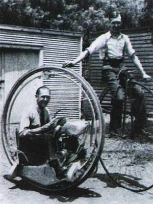 Человек на велосипеде «паук» (1880-е годы) рядом с Уолтером Нилссоном, пилотирующим собственный моноцикл. 1935 год.