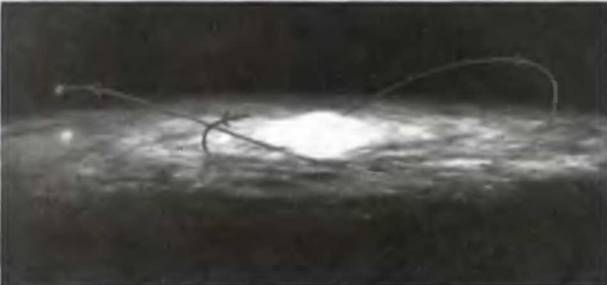 Более того, решение Керра допускает даже прохождение корабля «сквозь самый центр» дыры, то есть сквозь центральное кольцо на «другую» его сторону. Расчеты показывают, что «по ту сторону» дыры находится «отрицательное» пространство- время, в котором либо расстояния и время, либо гравитация становятся негативными. Представить себе «отрицательное расстояние» нормальному человеку, думается, не под силу, но зато «отрицательное тяготение» представимо легко – это попросту отталкивание (то есть не «стягивающая», а «распирающая» сила, нечто вроде той загадочной «темной энергии», или «квинтэссенции», которая, по нынешним представлениям, повинна в том, что наша Вселенная расширяется не равномерно, а ускоренно).