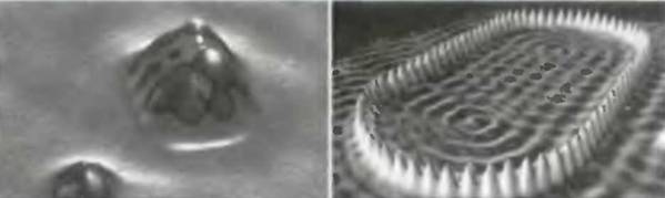 Растровый туннельный микроскоп позволил заглянуть в микромир. Слева: атомы натрия и йода на медной подложке. Справа: «стена» из атомов железа на медной подложке