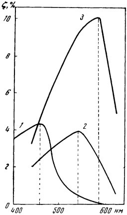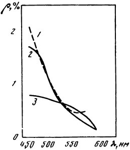 Рис. 47. Спектральная зависимость коэффициента яркости для вод Тихого океана 1, Средиземного 2 и Черного 3 морей