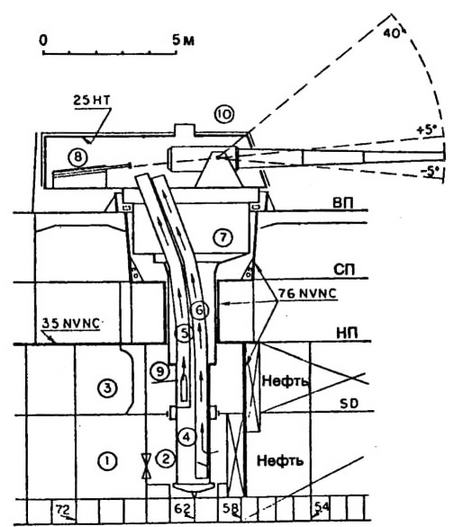 1 - зарядный погреб; 2 - перегрузочное зарядное отделение; 3 - снарядный погреб; 4 - центральный ствол; 5,6 - снарядный и зарядный подъемники; 7 - энергетическое отделение; 8 - гидравлический досылатель; 9 - перегрузочное снарядное отделение; 10 - 10-мм стальная облицовка поверх брони