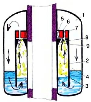 Далее пар конденсируется на поверхности внешней части сосуда, и вода стекает вниз. Вот так туда-сюда и циркулирует теплоноситель, производя энергию из бросового тепла.