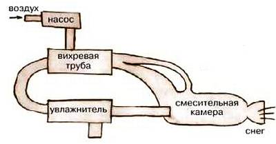 • Дмитрий Кастерин, член кружка юных изобретателей из Соснового Бора, придумал пушку непрерывного действия, выстреливающую снеговыми зарядами. В основу ее положен эффект Ранка, суть которого заключается в следующем. Если в цилиндрическую камеру тангенциально подавать сжатый воздух, закручиваясь внутри, он разделится на два потока. С одного конца камеры начнет выходить холодный воздух, а с другой — горячий. Разность температур между потоками может достигать 150… 200°.