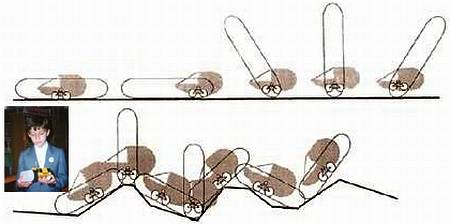 • Необычный движитель предлагает установить на вездеходах Эльдар Ошхунов, член автомодельного кружка Центра научно-технического творчества г. Нальчика. Принцип действия его можно понять по кинематической схеме. Кузов вездехода опирается опорно-ведущими катками на внутреннюю замкнутую опорную дорожку вытянутых грунтозацепов. Катки вместе с кабиной сначала плавно перемещаются вдоль движителя, а когда достигают конца, грунтозацепы опрокидываются на другую сторону. Статический контакт необычного движителя не повреждает почву, исключает большие потери на трение. По мнению автора, подобный вездеход одинаково легко сможет преодолевать зыбучие пески и трясину болота, ледяные торосы и каменные завалы.