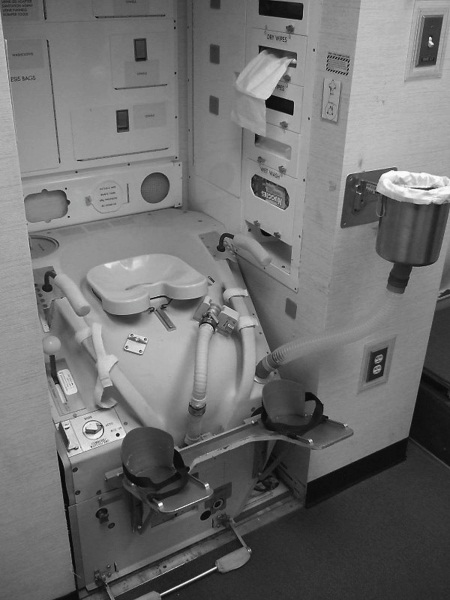 Внешне космический туалет похож на те, какими пользуются на Земле. Но без отличий, конечно, не обошлось. Для того чтобы компенсировать действие невесомости, в нем предусмотрены фиксаторы для ног и бедер. Создаваемый же внутри устройства вакуум обеспечивает плотное прилегание бедер к толчку.