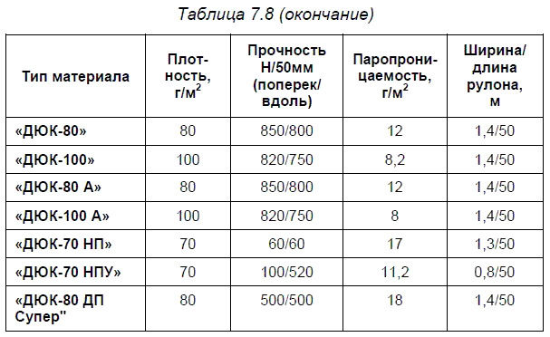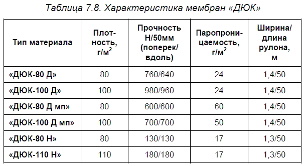 Марка «ДЮК» предлагает композитные полипропиленовые мембраны шириной 1,4 м собственного производства: «ДЮК-80 Д», «ДЮК-100 Д», «ДЮК-80 Д Мп» и «ДЮК-100 Д Мп» (табл. 7.8).
