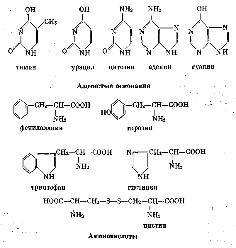 В живых организмах нас больше всего интересует влияние ультрафиолетовых лучей на биополимеры — белки и нуклеиновые кислоты. Участие фотосенсибилизаторов в этом случае пока точно не установлено. Вероятно, оно невелико, ибо белки и нуклеиновые кислоты сами интенсивно поглощают ультрафиолетовые лучи. Очень хорошо поглощают свет молекулы, в которых атомы углерода и азота образуют кольцевые структуры. Такие кольца имеются и в молекулах биополимеров. В нуклеиновых кислотах — это азотистые основания, в первую очередь пиримидиновые (тимин, урацил, цитозин) и пуриновые (аденин, гуанин), поглощающие в основном лучи с длиной волны 2600—2650 А. В белках циклические аминокислоты триптофан, тирозин, фенилаланин, гистидин хорошо поглощают лучи длиной 2800 А.