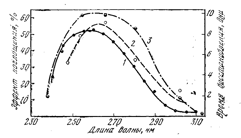 Рис. 16. Кривые поглощения ультрафиолетовых лучей нуклеиновыми кислотами (1), торможения клеточного деления (2) и мутагенного действия ультрафиолетовых лучей (3)