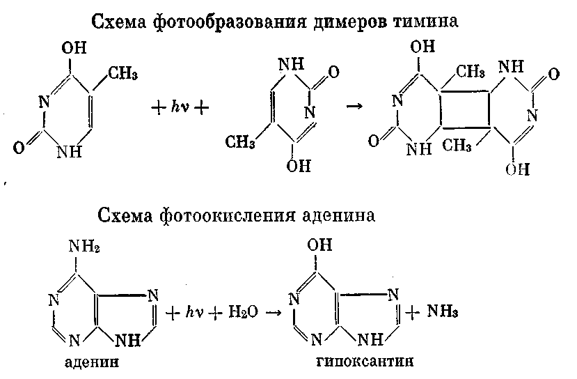Процесс образования димеров (тимина, а также цитозина, димеров тимин-цитозин) лежит в основе не только задержки роста и деления, не только гибели клеток, но и мутагенного, генетического действия. Возникновение прочных валентных связей между азотистыми основаниями нарушает генетический код, искажает смысл наследственной информации. Ведь наследственный язык клетки — четырехбуквенный, именно азотистые основания — его буквы. Точнее, тройка (триплет) азотистых оснований — простейшая единица генетического кода. Если прочная связь возникает (благодаря энергии ультрафиолета) между соседними тиминами в пределах одной нити ДНК, то процесс самоудвоения ДНК и деления клетки не нарушается. Зато дочерние клетки получат по наследству шифровку с опечатками — их жизненная программа будет запутана, опасные абракадабры могут послужить и причиной смерти где-то через 2—3 поколения, либо жизнедеятельность клетки окажется серьезно нарушенной. Так атомно-молекулярные перегруппировки, ставшие возможными благодаря избыточной энергии квантов ультрафиолетовых лучей, сами становятся причиной нарушения жизни клеток, тканей, органов, всего организма.