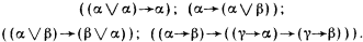 Мы ввели множество базовых элементов и множество синтаксических правил. Теперь необходимо ввести множество аксиом. В логике в качестве множества аксиом выбирают обычно совокупность правильных формул, которые являются общезначимыми (или тождественно истинными). Высказывания, описываемые этими формулами, таковы, что они всегда истинны. Вот пример такого множества формул: