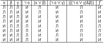 ?)&?)). В этой формуле (будем обозначать ее ?) имеется три высказывания, что приводит к необходимости рассмотрения истинного значения ? на 23=8 комбинациях. Эти комбинации и соответствующие шаги по определению истинностного значения ? на них даны в табл. 3, в которой И и Л означают соответственно значения «истина» и «ложь».