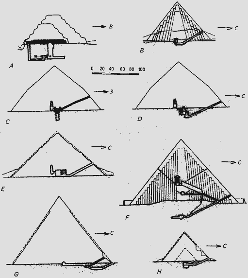 Теперь следует коротко пересказать историю пирамидоустроения в Египте. Эти сведения элементарны, описаны в учебниках, которые цитировать не принято. Схемы пирамид см. на рис. 86.