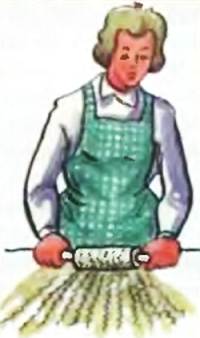 Вот и предлагает наш постоянный читатель Василий Никитенко приспособление для нарезки лапши не только лентами, но и различными фигурами. Приспособление Василия похоже на ту же скалку. Это стержень с ручками, на него надеваются режущие элементы — кольца, получается ребристая скалка. Расстояние между кольцами определяет ширину нарезаемых лент. Если кольца изогнуть вбок, чтобы соседние соприкасались торцами, будут получаться листики или ромбики. Особенно трудно нарезать тонкую соломку, а здесь — нет проблем. Набрал на стержень побольше режущих колец, и пожалуйста — за один проход можно получить целый сноп тончайшей продукции. Режущие кольца можно изготовить из жести от консервных банок. Такую скалку-лапшерезку нетрудно изготовить каждому дома.