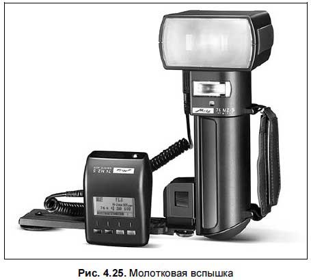 По конструкции вспышки делятся на «башмаки», «молотки» и студийные вспышки. Башмачными (башмаковыми) называются вспышки, которые непосредственно укрепляются на камере в разъем, который еще называют «горячий башмак» из-за характерной формы разъема. Другие вспышки крепятся сбоку от камеры, имеют большие размеры и по форме напоминают большой молоток (рис. 4.25) или киянку. За это их и называют «молотками». Конструкция таких вспышек позволяет поместить в них конденсаторы повышенной мощности, более мощные лампы, они крайне надежны и очень любимы журналистами за их возможность вести серийную съемку. Студийными вспышками называют стационарные устройства, у которых очень мощный источник импульсного света и устройство для заряда от сети. Как правило, такие вспышки имеют богатый арсенал различных диффузоров, которые приобретаются отдельно и служат для разных условий освещения объектов съемки.