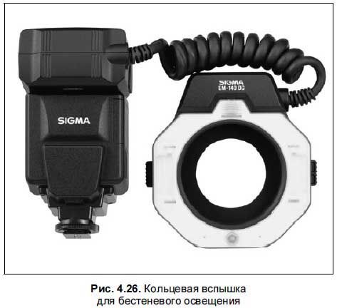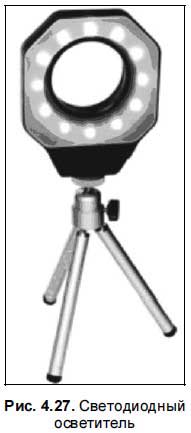 Стоимость кольцевых вспышек (рис. 4.26) очень высока, и, как правило, из-за этого они недоступны большинству фотолюбителей. Но если у вас цифровая камера, можно применять светодиодный бестеневой осветитель (рис. 4.27) AcmePower AP RL1200.