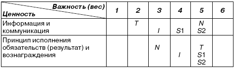Следующим этапом формирования стратегии была разработка шкал ценностей. Ценности ранжировались по следующим пяти позициям: 1) традиционные (T), 2) «новые» (N), 3) фактические, характерные для ситуации на BMW (I), 4) современные, но уже фиксируемые, т. е. нынешняя стратегическая позиция в сфере персонала (S1), (5) ожидаемые в будущем, т. е. будущая стратегическая позиция в сфере персонала (S2). Каждая из ценностей оценивалась по шкале из шести рангов, где «1» означало наименьшую, а «6» – наиболее высокую важность (вес).