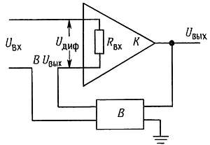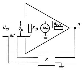 Входное напряжение Uвх уменьшается на величину ВUвых, и на выходах усилителя действует дифференциальное напряжение Uдиф = Uвх — ВUвых. Входной ток при этом равен