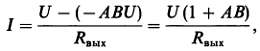 На этой схеме выходной импеданс показан в явном виде. Для упрощения вычислений воспользуемся следующим приемом: замкнем вход накоротко и положим, что выходное напряжение равно U; определив выходной ток I, найдем выходной импеданс R'вых = U/I. Напряжение U на выходе создает на входе усилителя падение напряжения, равное — B/U, которое в свою очередь создает во внутреннем генераторе усилителя напряжение — ABU. Выходной ток при этом равен
