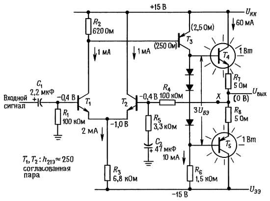 Выходной импеданс. В связи с тем что сопротивление коллектора транзистора Т3 велико, можно считать, что на выходные транзисторы работает источник с сопротивлением 1,5 кОм (R6). Выходной импеданс составляет приблизительно 15 Ом (h21Э ~= 100) плюс эмиттерное сопротивление, равное 5 Ом, итого 20 Ом. Собственным эмиттерным сопротивлением величиной 0,4 Ом можно пренебречь.