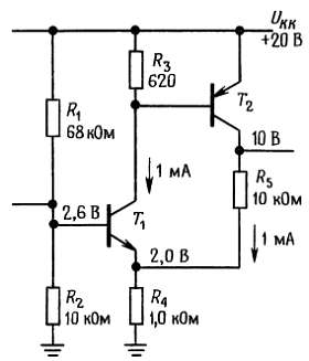 Если рассматривать Τ1 как усилитель, который усиливает падение напряжения между базой и эмиттером (вспомним модель Эберса-Молла), то видно, что обратная связь передает на вход часть выходного напряжения и вычитает его из входного сигнала. В схеме есть небольшая хитрость: дело в том, что коллекторный резистор транзистора Т2 входит еще и в схему обратной связи. Используя описанную выше технику расчета, вы можете показать, что Kразомкн. цепь OC ~= 200.