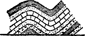 Читатель, никогда не бывавший в горах и не видевший этих складок своими глазами, скажет с недоверием: не может этого быть! Пласты таких твёрдых пород, как песчаники, известняки, сланцы, — не бумага, не сукно, не кожа, которые можно гнуть, как угодно. Так раньше думали и учёные и поэтому считали, что складки образовывались в то время, когда горные породы были ещё мягкие и представляли собой песок, глину, ил. Но изучение гор показало, что горные породы действительно изгибались в твёрдом состоянии. Это видно из того, что пласты сильно потерпели при изгибах — они разорваны мелкими трещинами, местами даже раздроблены, а части разорванных пластов нередко отодвинуты друг от друга (рис. 10). Такие разорванные складки можно видеть в горах; сдвиги иногда достигают огромной величины.