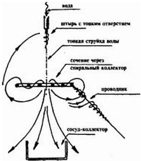 Рис. 2 Эксперимент со спирально закручивающейся струей воды. Схематическое изображение прохождения тонкой струи воды по спиралевидному заряженному коллектору