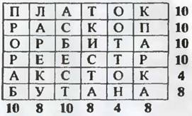 ПЛАТОК, РАСКОП, ОРБИТА, РЕЕСТР, СТОК, БУТАН, ПРОРАБ, ЛАРЕК, АСБЕСТ, КИСТА, ТОН, ПАРКА