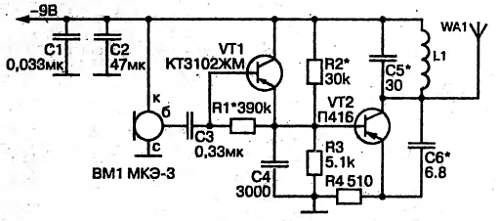 Электретный микрофон ВМ1 оборудован встроенным предусилителем, обеспечивающим его высокую чувствительность. Транзистор VT1 включен по схеме с общим эмиттером. Его коллекторной нагрузкой является резистор R3, а режим по постоянному току задается сопротивлением резистора R1, которое нужно подобрать так, чтобы потенциал коллектора был примерно равен половине напряжения питания. Частота генератора определяется колебательным контуром L1, С5 и устанавливается в пределах от 66 до 74 МГц подбором емкости С5 и смещением витков контурной катушки. Она Наматывается на оправке диаметром 4 мм и содержит 6 витков провода ПЭВ-2 диаметром 0,56 мм. Намотка принудительная, с шагом 1,5 мм.