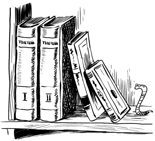 Есть насекомые, грызущие книги, прогрызающие лист за листом и прокладывающие себе таким образом путь сквозь толщу книги. Один такой «книжный червь» прогрыз себе путь от первой страницы первого тома до последней страницы второго тома, стоявшего рядом с первым, как здесь нарисовано.