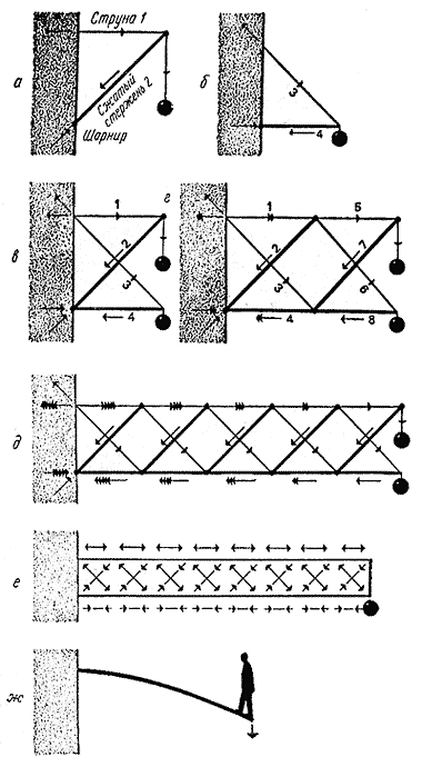 Пристроив к полученной конструкции еще одну, точно такую же, мы получим новую ферму, показанную на рис. 13, г. В этом случае тот же самый груз 2W поддерживается сжатыми и растянутыми наклонными элементами 2, 3, 6 и 7, в то время как элементы 1, 5, 4 и 8 сжаты и растянуты в горизонтальном направлении и, хотя они не поддерживают внешнюю нагрузку непосредственно, благодаря им ферма не рушится. Получается, что каждый элемент выполняет свою функцию и, если хотя бы один стержень или одна струна выйдет из строя, катастрофа неизбежна: каждый элемент по-своему важен.